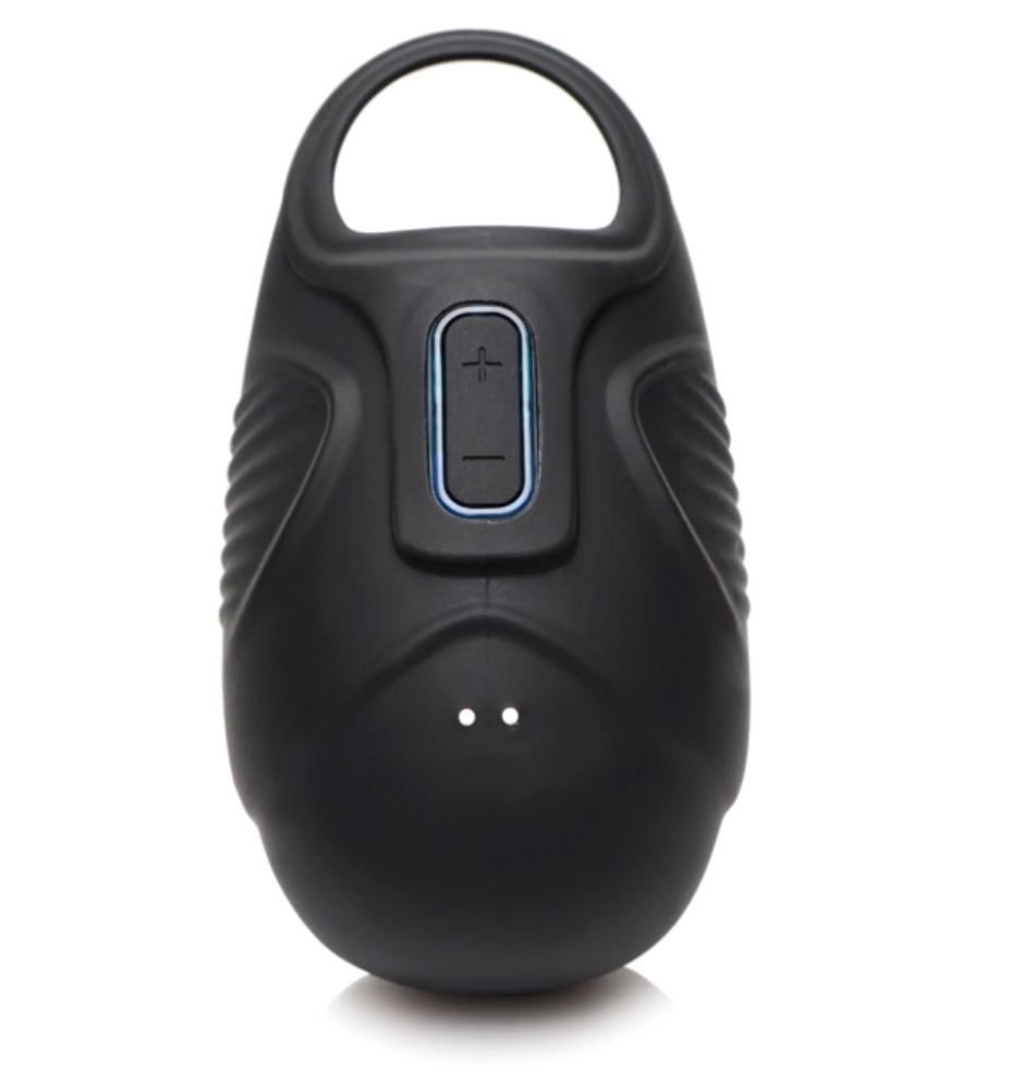 Like the pulsating scrotum cup, this testicle teaser also harnesses your shaft with a double penis ring in this case, looping over your base, making sure the whole package hums when you dial through vibration speeds.